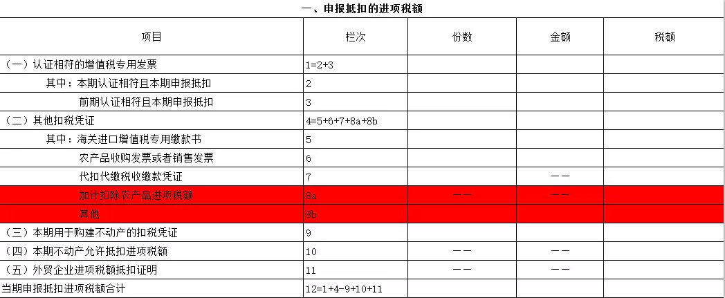 新增8a"加計(jì)扣除農(nóng)產(chǎn)品進(jìn)項(xiàng)稅額"欄,填寫(xiě)納稅人將購(gòu)進(jìn)的農(nóng)產(chǎn)品用于生產(chǎn)銷(xiāo)售或委托受托加工17%稅率時(shí),為維持原農(nóng)產(chǎn)品扣除力度不變加計(jì)扣除的農(nóng)產(chǎn)品進(jìn)項(xiàng)稅額。該欄不填寫(xiě)"份數(shù)""金額",執(zhí)行農(nóng)產(chǎn)品增值稅進(jìn)項(xiàng)稅額核定扣除辦法的農(nóng)產(chǎn)品進(jìn)項(xiàng)稅額不填列在該欄。